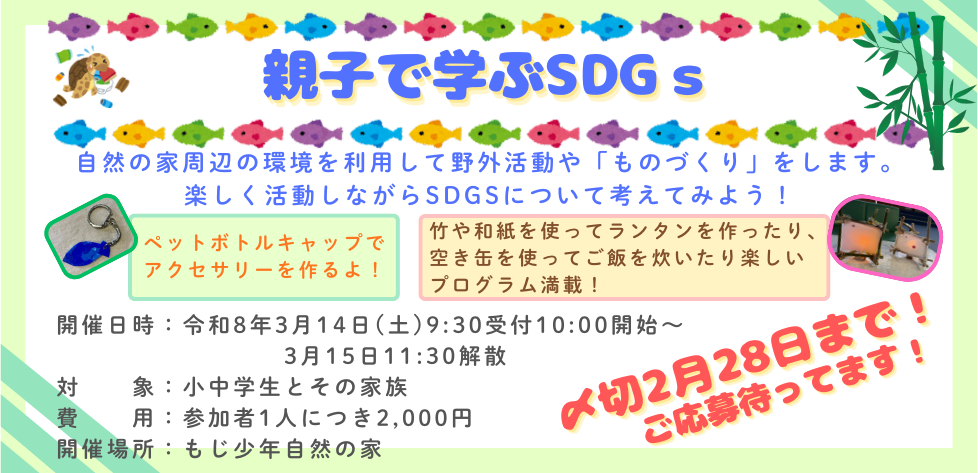 | 令和8年3月14日~15日 | 親子で学ぶSDGs | 小中学生とその保護者 | 応募はコチラから 令和8年2月28日締め切り |